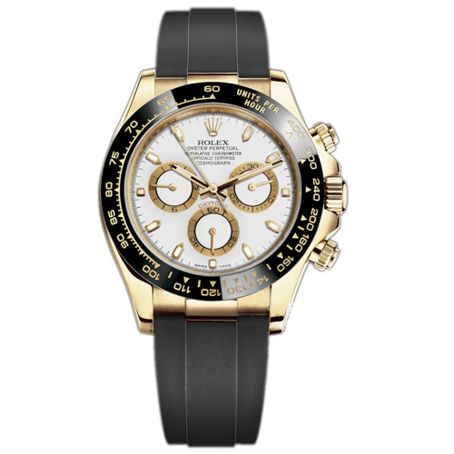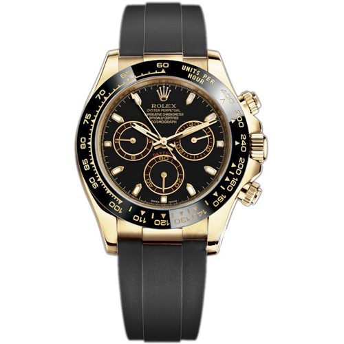 Rx Cosmograph Daytona, 18k Yellow Gold 40mm watch, Reference 116518ln-0048. This model has Champagne/gold colored dial with black sub-dials. Applied black rimmed index hour markers with luminous fill. Polished 18k Yellow Gold hour and minute hands with black centerline and partial luminous fill. Fine printed minute/seconds and fractions of a second track on teh dial perimeter. Polished 18kt Yellow Gold screw-down crown with Rx's patented "Triplock" triple waterproofness system, ensuring that the crown screws down against the Oyster case as securely as a submarine hatch. Screw-down chrono buttons in polished 18kt Yellow Gold. The dial closed by a Scratch-resistant Sapphire Crystal and solid 18kt Yellow Gold made case back. Chronograph/Stop watch function: large central seconds counter hand - accurate up to 1/8th of a second; 30-minute counter sub-dial located at the 3 o'clock position; 12-hour counter sub-dial located at the 9 o'clock position. Continuous running small seconds hand sub-dial located at the 6 o'clock position. The watch is equipped Black "Cerachrom" bezel, made of highly durable ceramic that is extremely hard, highly scratch-resistant, has excellent corrosion resistant properties and is unaffected by ultraviolet rays so the color will not fade. Yellow gold-filled engraved tachymeter scale on the bezel. The watch is mechanical chronograph; self-winding Manufacture Rx 4130 contains 44 Jewels and has an approximate power reserve of 72 running the time only, or 66 hours with the chronograph function running. This model presented on Oysterflex strap of Flexible metal blades overmoulded with high-performance elastomer and a Folding Oysterlock safety clasp with Easylink 5 mm comfort extension link. The water resistance is up to 100m/330ft (10 ATM).