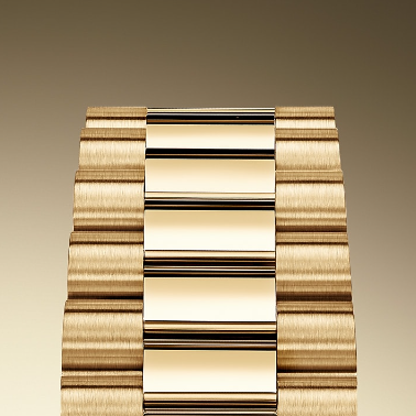 The design, development and production of Rx bracelets and clasps, as well as the stringent tests they face, involve advanced high technology. And, as with all the components of the watch, aesthetic controls by the human eye guarantee impeccable beauty. The President bracelet, with its semi-circular three piece links, was created in 1956 for the launch of the Oyster Perpetual Day-Date. It represents the ultimate in refinement and comfort and is always made of carefully selected precious metals.
