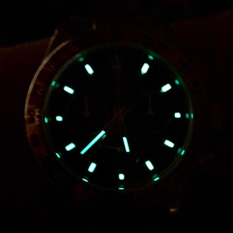 Rx Daytona Swiss Replica watches are equipped with the new SuperLuminova™ Blue glow luminescent pigment that after sufficient activation by sunlight or artificial light will glow in the dark up to nine hours with uniform luminosity throughout.