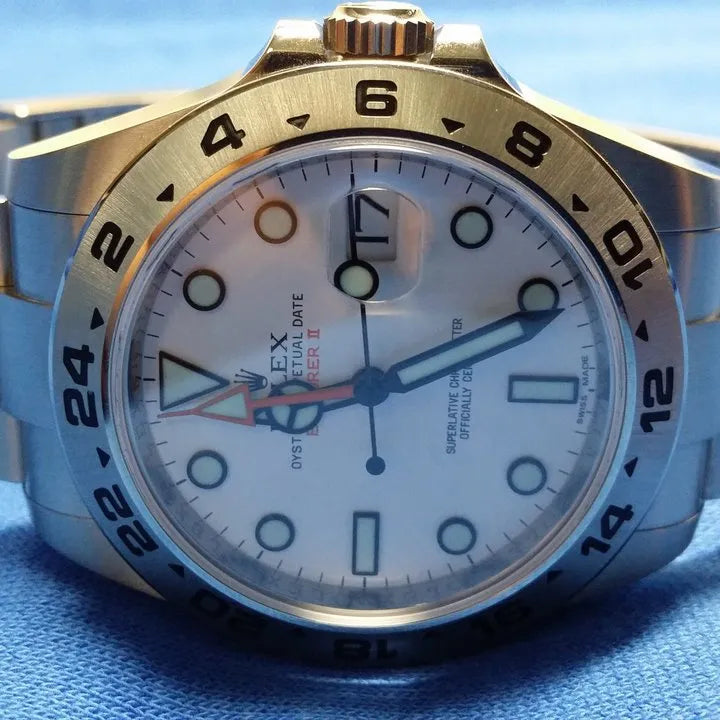 Rx Explorer II Swiss Replica watches are equipped with the new SuperLuminova™ Blue glow luminescent pigment that after sufficient activation by sunlight or artificial light will glow in the dark up to 9 hours with uniform luminosity throughout.