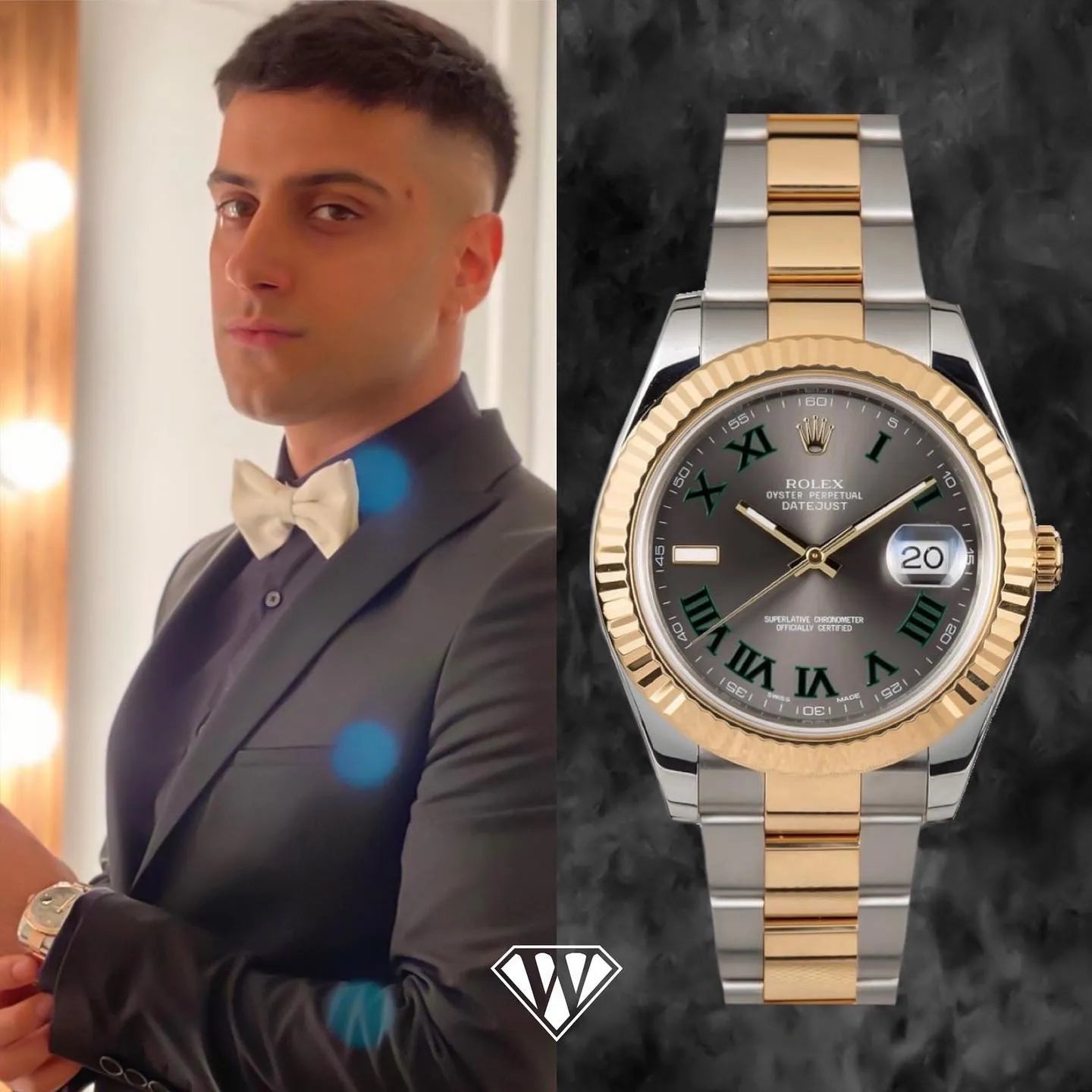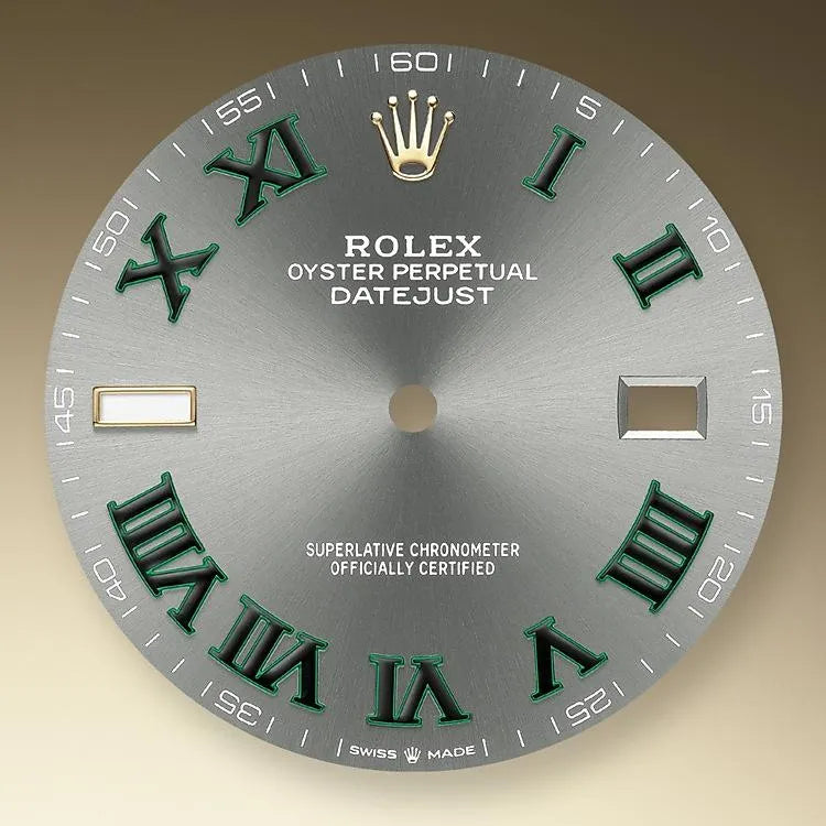 41mm Yellow Rolesor case with 904L steel monobloc middle case, screw-down steel back, 18K yellow gold screw-down crown, 18K yellow gold fluted bezel, scratch-resistant double anti-reflective sapphire crystal with cyclops lens over the date, slate dial, green Roman numerals, Rx caliber 3235 perpetual self-winding movement with date at 3 o’clock that changes instantaneously at midnight in a few thousandths of a second, approximately 70 hours of power reserve, yellow Rolesor Oyster bracelet made from a combination of 904L steel and 18K yellow gold with three-piece links, folding Oysterclasp buckle with Easylink 5mm comfort extension link. Waterproof to 100 meters.